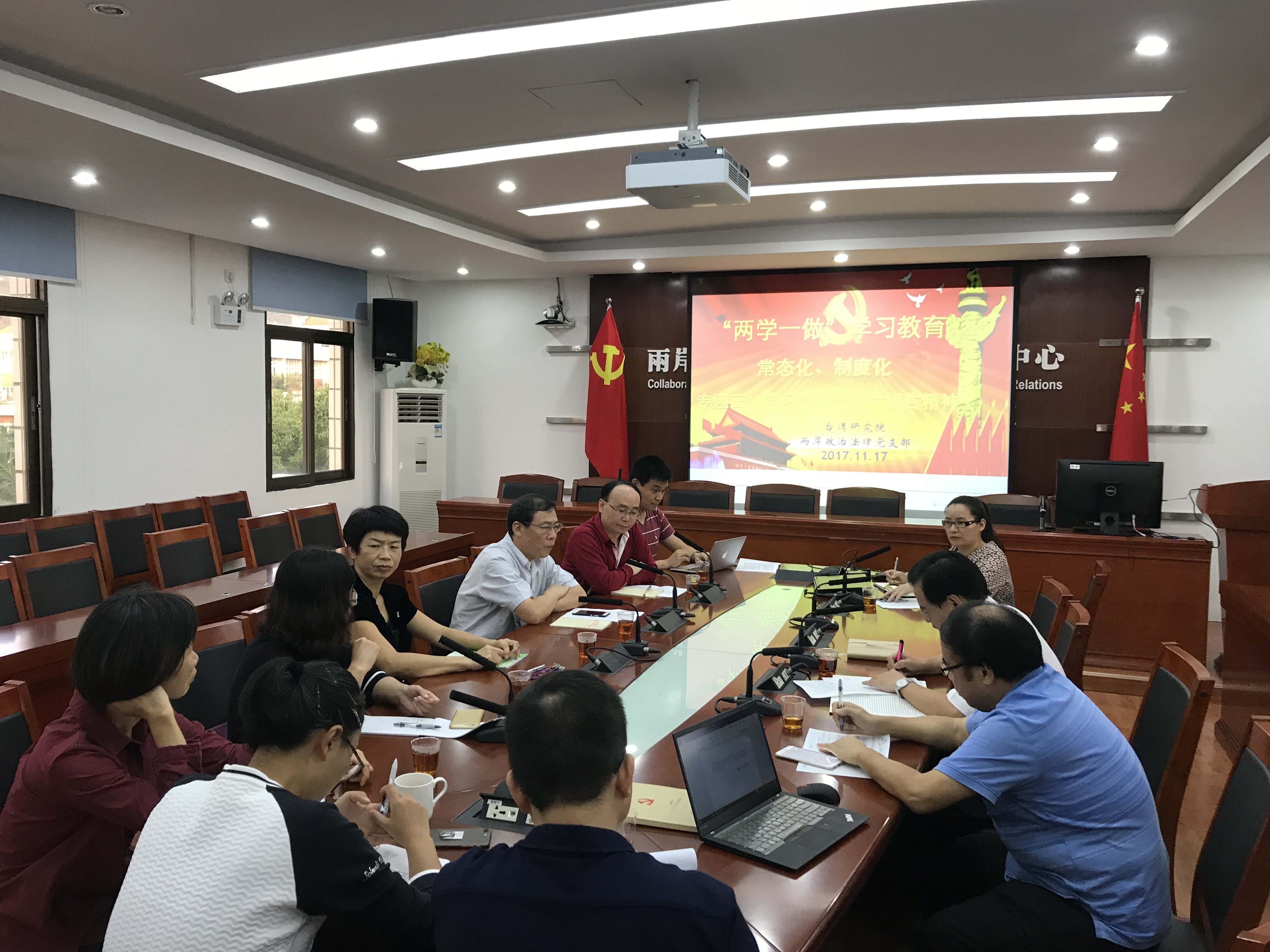 根据学校 “两学一做”学习教育常态化、制度化的部署和要求,在院党委指导下,为了提高学习成效,在前阶段个人学习基础上,台湾研究院两岸政治法律党支部于2017年11月17日在院5楼大会议室召开专题三集中学习活动。本次学习主要内容为深刻学习领会党的十九大报告精神,特别是习近平新时代中国特色社会主义思想。李建发副校长、副书记、台湾研究院党委成员,以及本支部教工党员共同出席参加此次学习活动。院党委曾坤瑜书记主持此次学习活动。