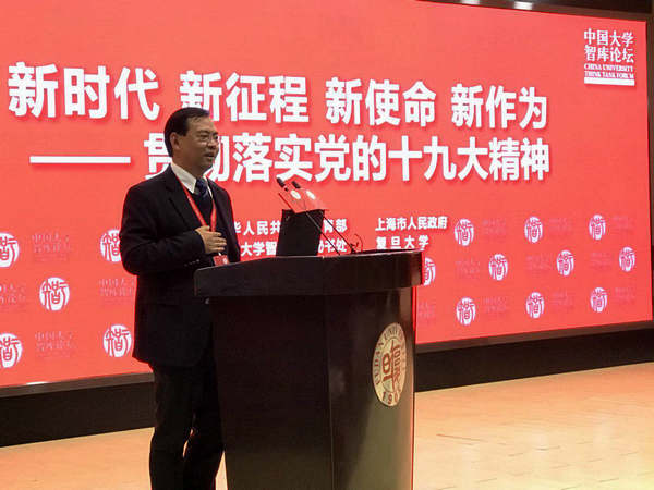 12月16日至17日,中国大学智库论坛2017年年会在复旦大学举行,本届论坛年会的主题是“新时代 新征程 新使命 新作为——贯彻落实党的十九大精神”。论坛由教育部和上海市政府指导,复旦大学和中国大学智库论坛秘书处主办。教育部党组副书记、副部长朱之文,上海市副市长翁铁慧,复旦大学党委书记焦扬等在开幕式致辞;全国政协教科文卫体委员会副主任李卫红、复旦大学校长许宁生等出席论坛开幕式。来自各级党政部门的领导和来自党校、高校、科研院所、民间智库的专家学者300余人相聚复旦,共话智库建设,共谋创新发展。我院院长李鹏教授作为嘉宾在论坛闭幕式上发表了题为“新时代推进祖国和平统一的新方略”的主题演讲,我校社科处林木顺副处长和其他兄弟院系负责人也参加了论坛。