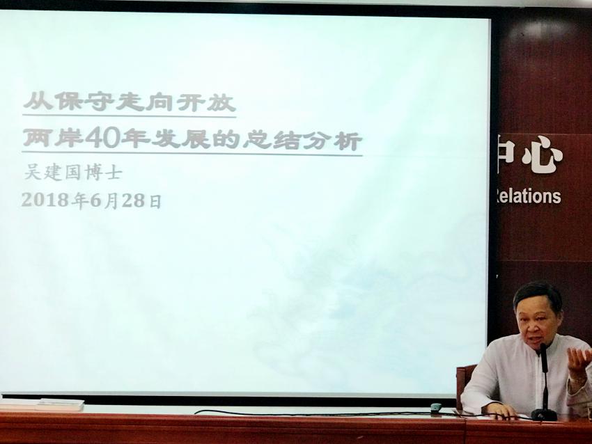 6月28日,曾任台湾高雄应用科技大学校长、现任台北市政府市政顾问的吴建国博士应邀莅临我院,开讲《从保守到开放:两岸40年发展的总结分析》学术讲座,我院副院长彭莉教授主持本次活动。