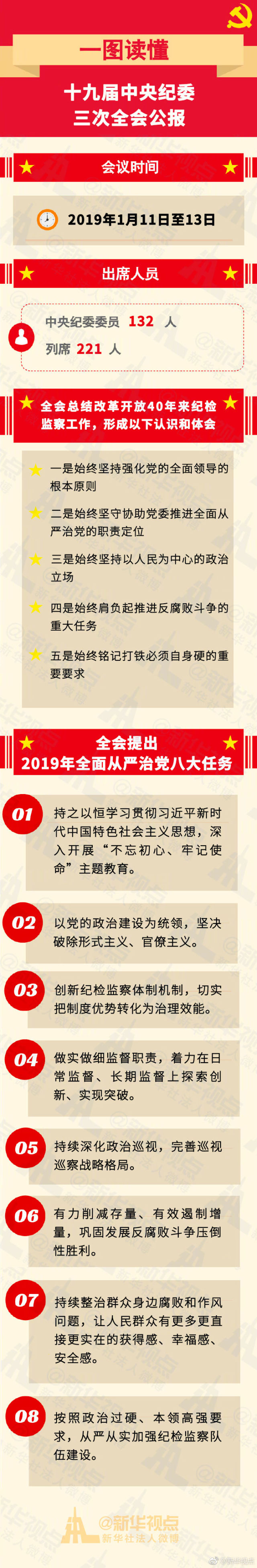 【一图读懂十九届中央纪委三次全会公报】为期3天的十九届中央纪委三次全会13日在北京闭幕。新华社受权发布了全会公报。此次中央纪委全会取得了哪些重要成果?对2019年全面从严治党、党风廉政建设和反腐败斗争又有哪些新的部署?详情戳图