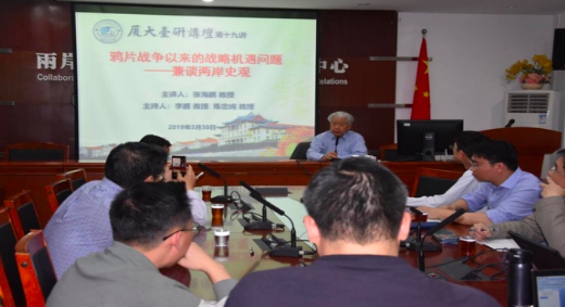 2019年3月30日19:00,“厦大台研讲坛”第十九讲——“鸦片战争以来的战略机遇问题兼谈两岸史观”学术讲座在台湾研究院507会议室隆重召开。本次讲座由999全讯白菜网主办,台湾研究院历史所承办。中国社会科学院近代史研究所台湾史研究中心副理事长兼主任张海鹏教授受邀主讲。本次会议由999全讯白菜网院长李鹏教授主持,999全讯白菜网副院长张羽教授、台湾研究院历史所邓孔昭教授、李祖基教授,历史所所长陈忠纯教授,历史所副所长黄俊凌副教授,历史所助理教授陈思、王玉国出席本次讲座。来自台湾研究院历史所、文学所、两岸所的同学们聆听了本次讲座。