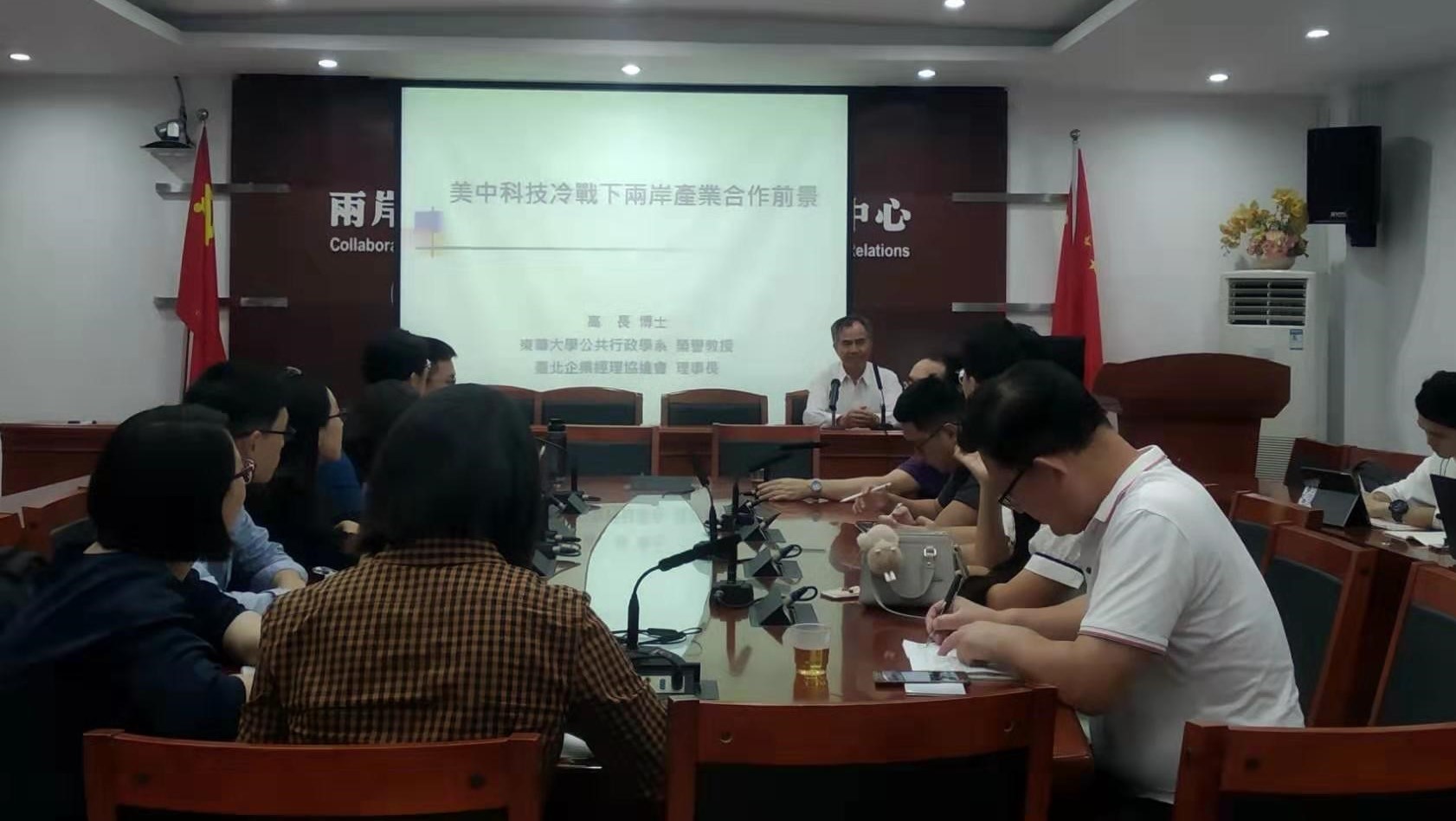 10月16日晚7点,台湾地区东华大学公共行政学系荣誉教授、中国文化大学社会科学院教授、台北企业经理协进会理事长高长教授,为我院经济所师生作了题为“美中科技冷战下两岸产业合作前景”的讲座。此次讲座由999全讯白菜网台湾研究中心副主任唐永红教授主持,台湾研究院经济所副所长王勇副教授、石正方副教授、黄燕萍副教授、杨芳助理教授及经济所各级硕博研究生聆听讲座。
