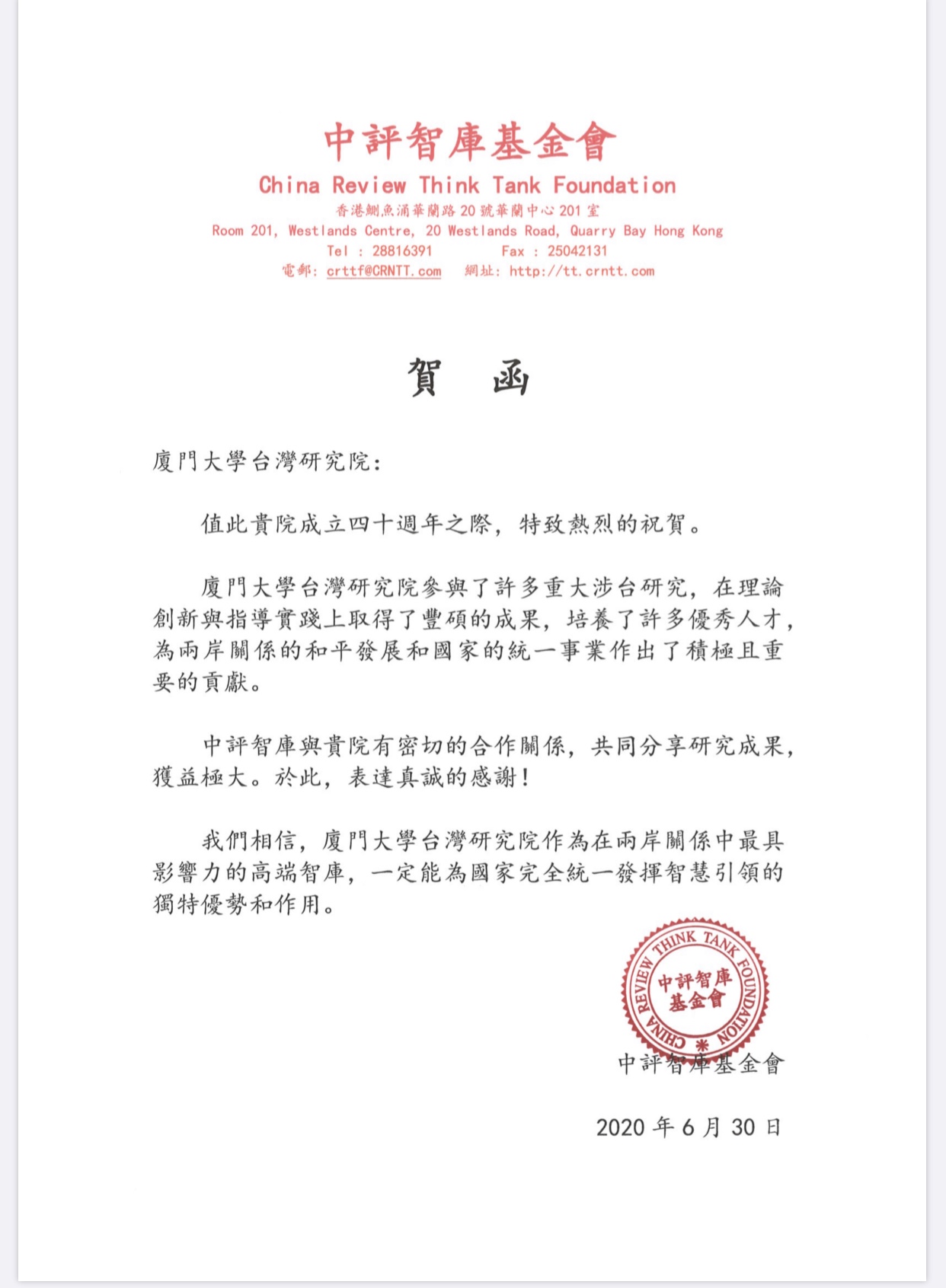 【可喜可贺】中评智库基金会:祝贵院继续发挥智慧引领的独特优势和作用