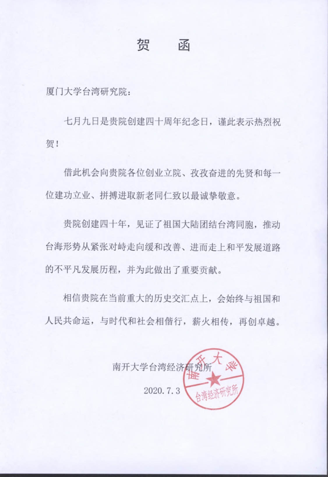 【可喜可贺】南开大学台湾经济研究所:祝贵院薪火相传,再创卓越!