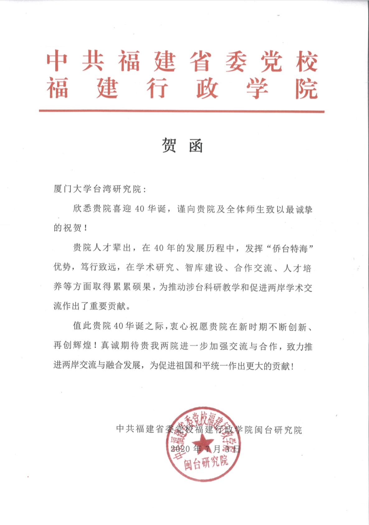 【可喜可贺】中共福建省委党校闽台研究院:祝在新时期不断创新、再创辉煌!