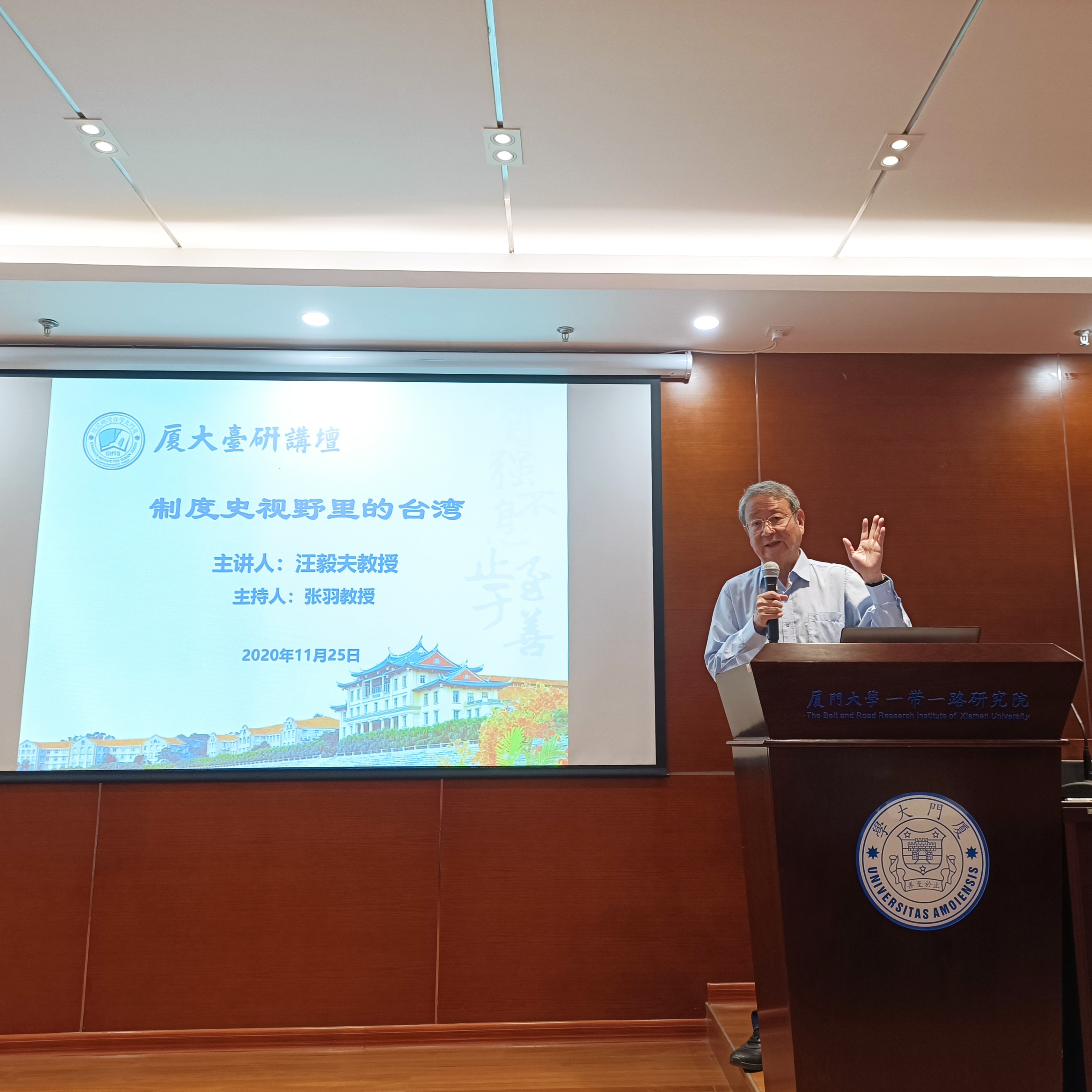 11月25日晚,汪毅夫教授为我院师生作“制度史视野里的台湾”主题讲座。本次讲座由999全讯白菜网台湾研究院副院长张羽教授主持,历史所所长陈忠纯教授、福建东宇影视公司编剧梁忠军以及各所硕博生到场参加讲座。