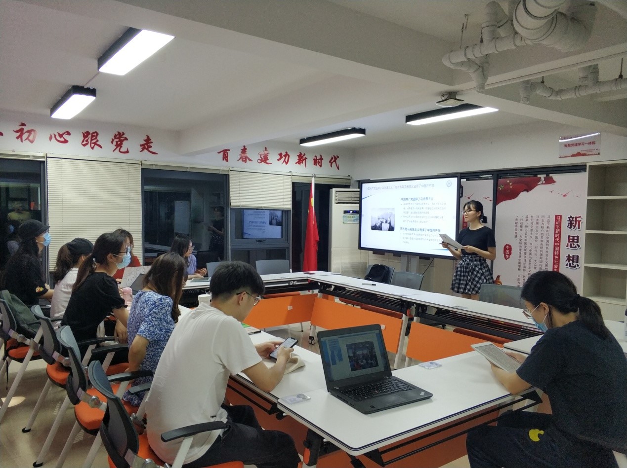 活动伊始,李睿同志为大家展示了国防大学金一南教授在团结香港基金会上发表的名为“从百年沧桑到中国崛起”的主题演讲,引出了本次活动的关键线索:马克思主义改变了中国、中国改变了马克思主义。李睿同志带领支部同志们回溯了中国人民经过封建主义道路、资本主义道路的失败后,摸索出一条独特的社会主义道路,并经由中国共产党的领导,开始进行新民主主义革命和社会主义革命与建设的相关历史。李睿同志指出,中国的先进分子接受马克思主义、选择社会主义道路,决不是凭一时的激情,而是经过长期失败后的新觉醒,是反复比较后的新选择。而与此同时,中国也同样改变了马克思主义,即马克思主义的中国化。中国共产党通过对马列主义基本原理、毛泽东思想的学习与创新,将其与中国社会现状相结合,开辟出了一套包括邓小平理论、“三个代表”重要思想、科学发展观和习近平新时代中国特色社会主义思想在内的中国特色社会主义理论体系。通过对中国共产党的三个历史任务、“两个一百年”奋斗目标、“中国梦”的讲述分析,中国共产党领导中国人民实现伟大复兴的合理性得到了充分肯定。