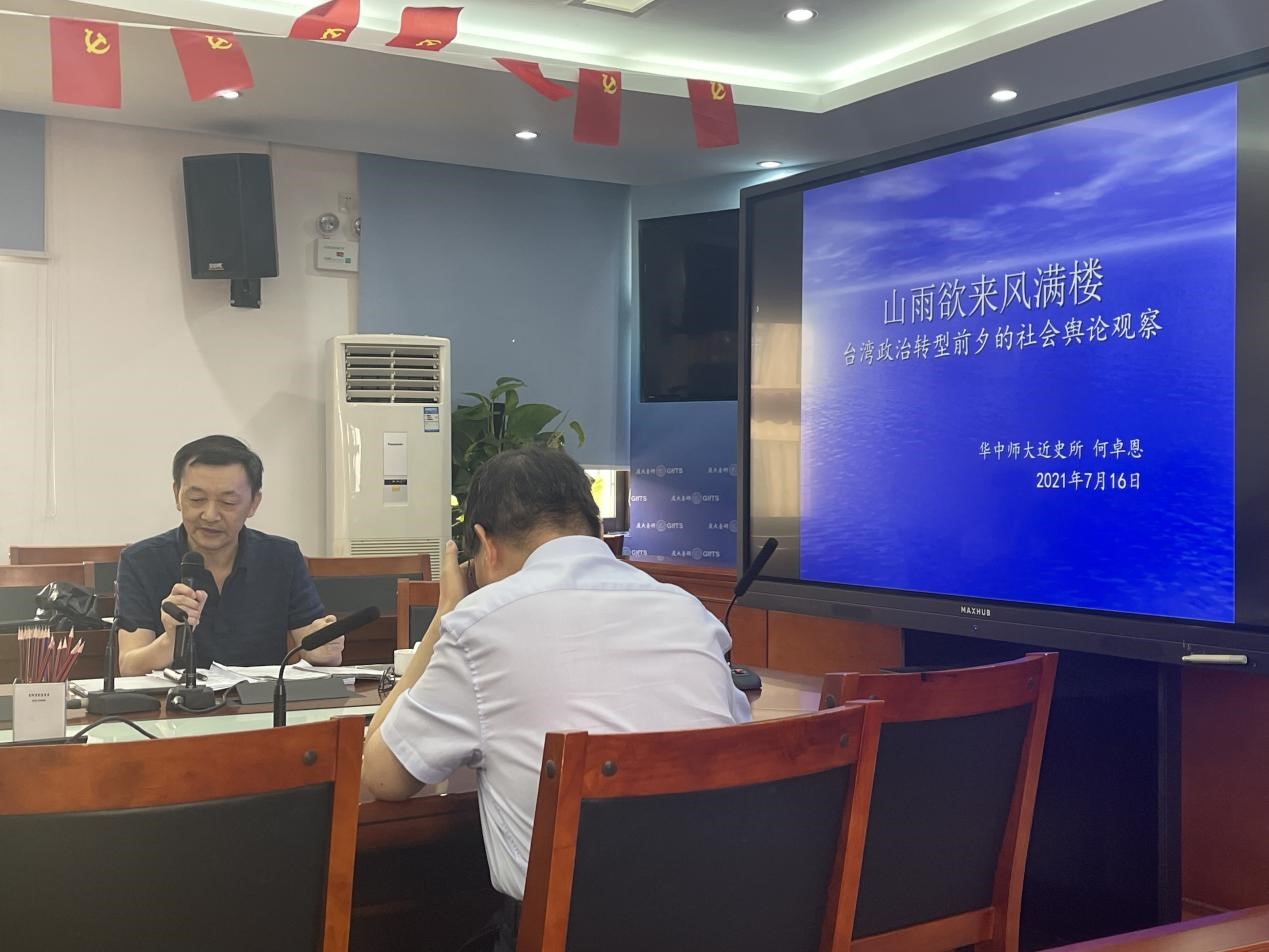 7月16日下午,华中师范大学中国近代史研究所何卓恩教授在台湾研究院507会议室为我院师生作了“台湾政治转型前夕社会舆论观察”主题讲座。讲座由我院历史所陈小冲教授主持,我院副院长兼政治所教授张文生担任与谈人。我院历史所邓孔昭教授、所长陈忠纯教授、陈思副教授、王玉国助理教授、王琪颖助理教授以及我院各所硕博生及历史系部分同学到场参加讲座。