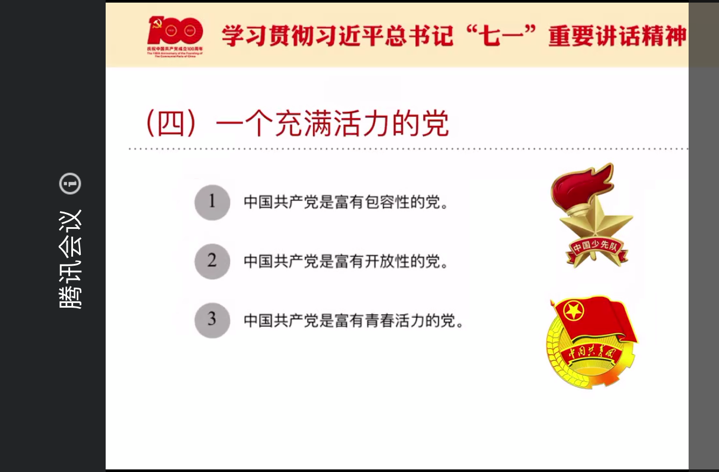 以史鉴今、资政育人,在线上观看的各位同学都深受启发。有感于黄昕通知的精彩讲述,支部成员纷纷分享了自己学习“七一“重要讲话精神的感想与心得体悟。中共党员茹珂楠表示身为青年学生党员,应当从三个方面来贯彻学习习近平总书记的重要讲话,第一要牢记初心使命、坚定理想信念,第二要弘扬光荣传统、赓续红色血脉,第三要响应主席号召、争取更大光荣。作为新时代学生青年党员,应当不负韶华、不服期许,努力学习专业知识,在各自的领域扎深根,干实事,为奋进新征程贡献青春力量。中共预备党员周澍阳同志在自学“七一”讲话内容后,不仅在思想上感到深深震撼,心中满怀自豪,更是对我党走向光明未来充满了信心。他说我们伟大的党正在意气风发地向着全面建成社会主义现代化强国的第二个百年奋斗目标迈进。习近平总书记的讲话,高屋建瓴、思想深刻、内容丰富,值得我们反复学习与体悟。共青团员陈明月也踊跃地分享了自己的感想,认为我党百年来历经了革命、改革和建设,是一代又一代的党员兢兢业业、踏实苦干的伟大成果。当代青年是成长中的一代,是改革中的一代,也是开创未来的一代。作为21世纪的青年,建设祖国的重任无疑是落在我们这一代人的肩上。我们要坚定理想信念,牢记初心使命,践行党的宗旨,努力成为能够担当民族复兴大任的时代青年。