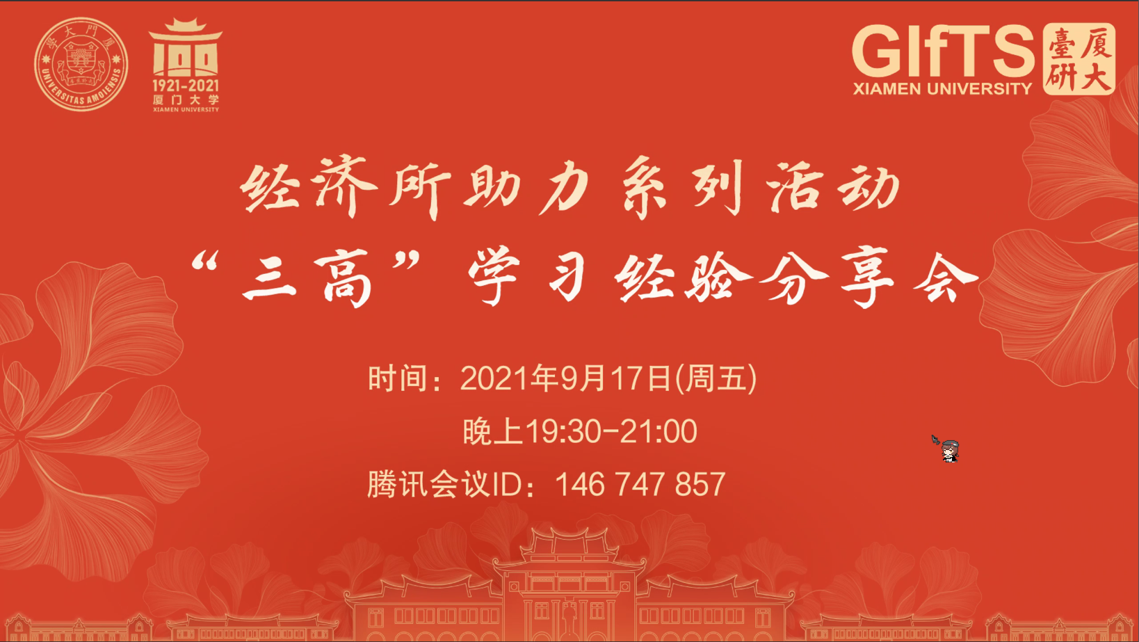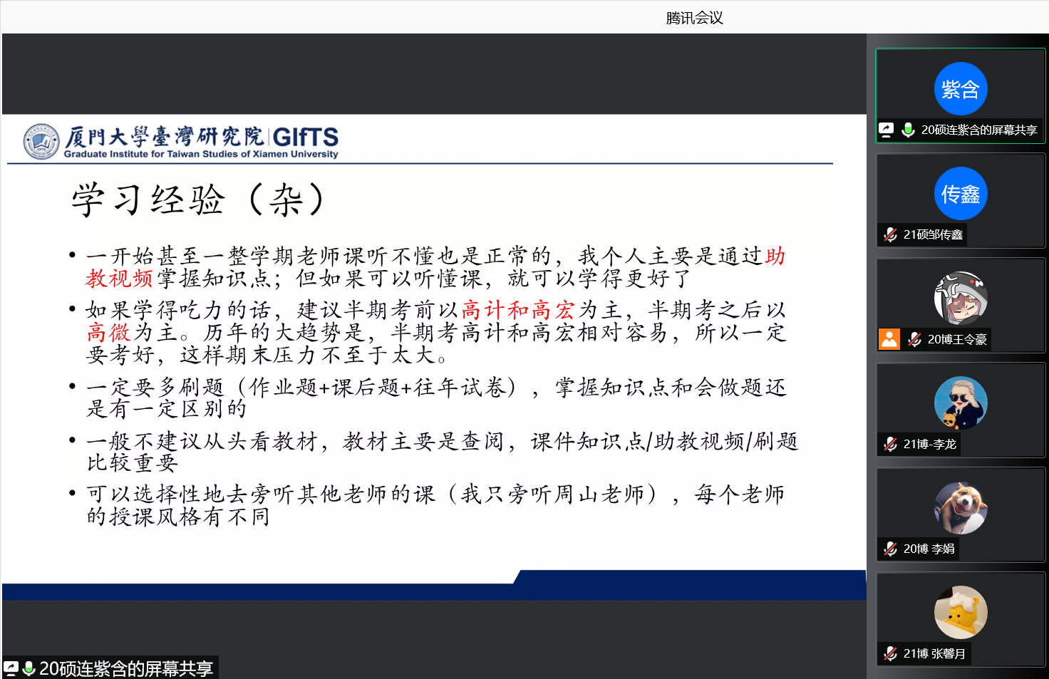 9月17日晚7点30分,我院经济所助力系列活动“三高”学习经验分享会在腾讯会议平台线上顺利开展,2020级和2021级全体硕博同学参与活动。经济所助力系列活动是我院经济所发起的学习、求职等多层面的经验分享平台。通过对学校学院规章制度、专业学习教育、学术科研、创业就业等方面的介绍,帮助经济所的同学提高研究生阶段的学习生活质量,及时解决生活学习就业中所遇到的问题。