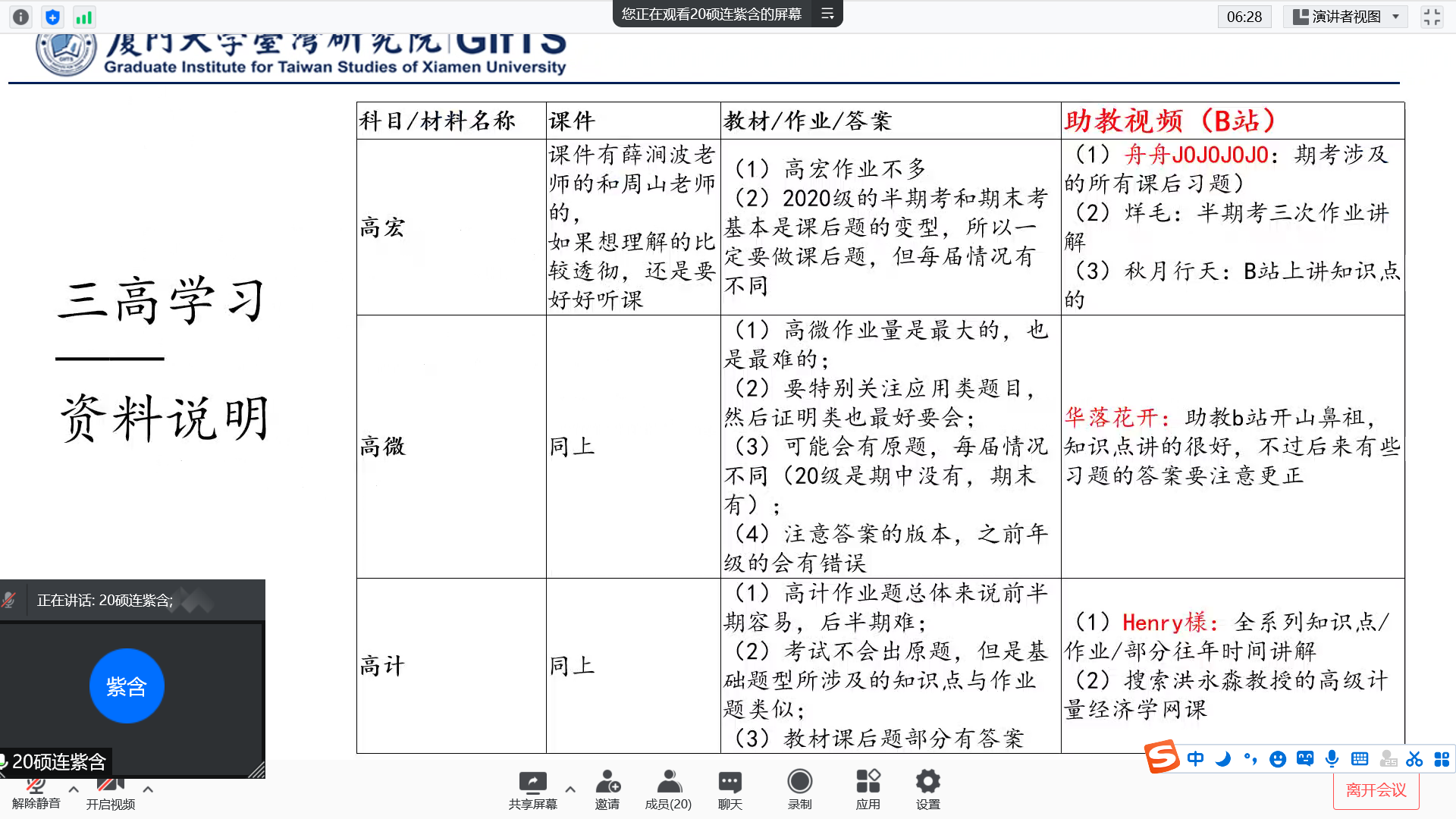 2020级硕士连紫含选用了详实的PPT,对高级宏微观经济学及高级计量经济学(以下简称“三高”)展开系统介绍,并按照专业科目、讲师课件、教材习题以及助教视频等方面进行延伸,并在分享关于“三高”的学习经验时提到,要尽快掌握住良好的课程学习节奏和学习习惯,合理分配好三门专业课程的学习时间和精力,有逻辑的结合专业课教材及助教视频,通过课后习题及历年考题梳理重点知识。