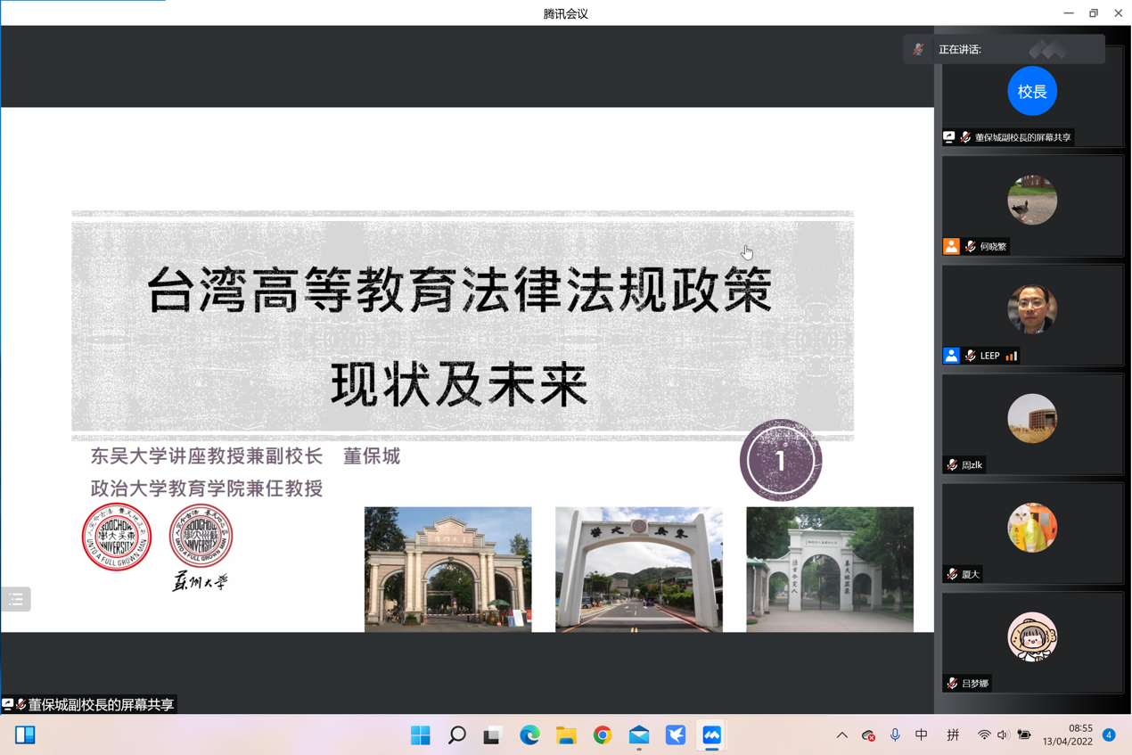 4月13日上午,台湾东吴大学副校长董保城教授应我院两岸关系研究所邀请,在线做题为“台湾教育法律法规政策的现状及未来”的专题学术讲座。院长李鹏教授主持,两岸所所长张宝蓉教授、何晓繁助理教授、张彩霞助理教授,以及教育研究院副院长覃红霞教授等近百名师生参加此次讲座。