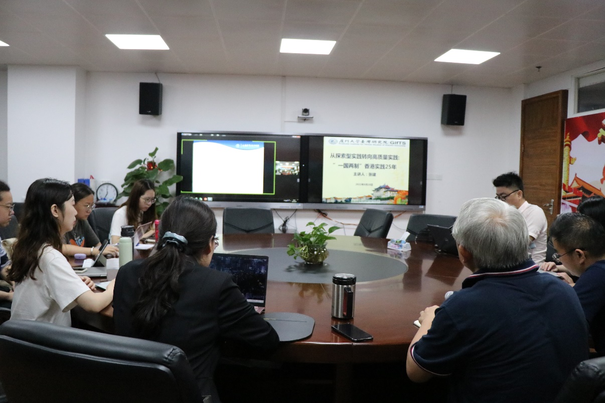 6月16日晚,我院港澳台研究中心邀请上海国际问题研究院台港澳所港澳研究室主任张建副研究员,在厦大嘉庚四418会议室举行题为“从探索型实践转向高质量实践:‘一国两制’香港实践25年”的学术讲座。本场讲座由我院港澳台研究中心副主任、台湾研究院政治所副所长王贞威主持,政治所所长陈先才教授出席,台湾研究院硕博生共计四十余人通过线上线下方式参加。