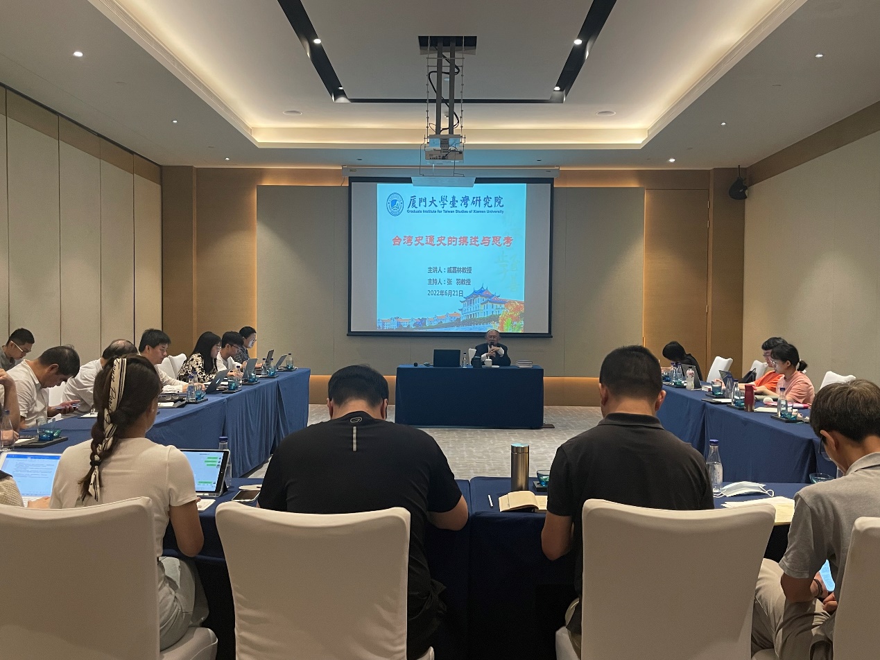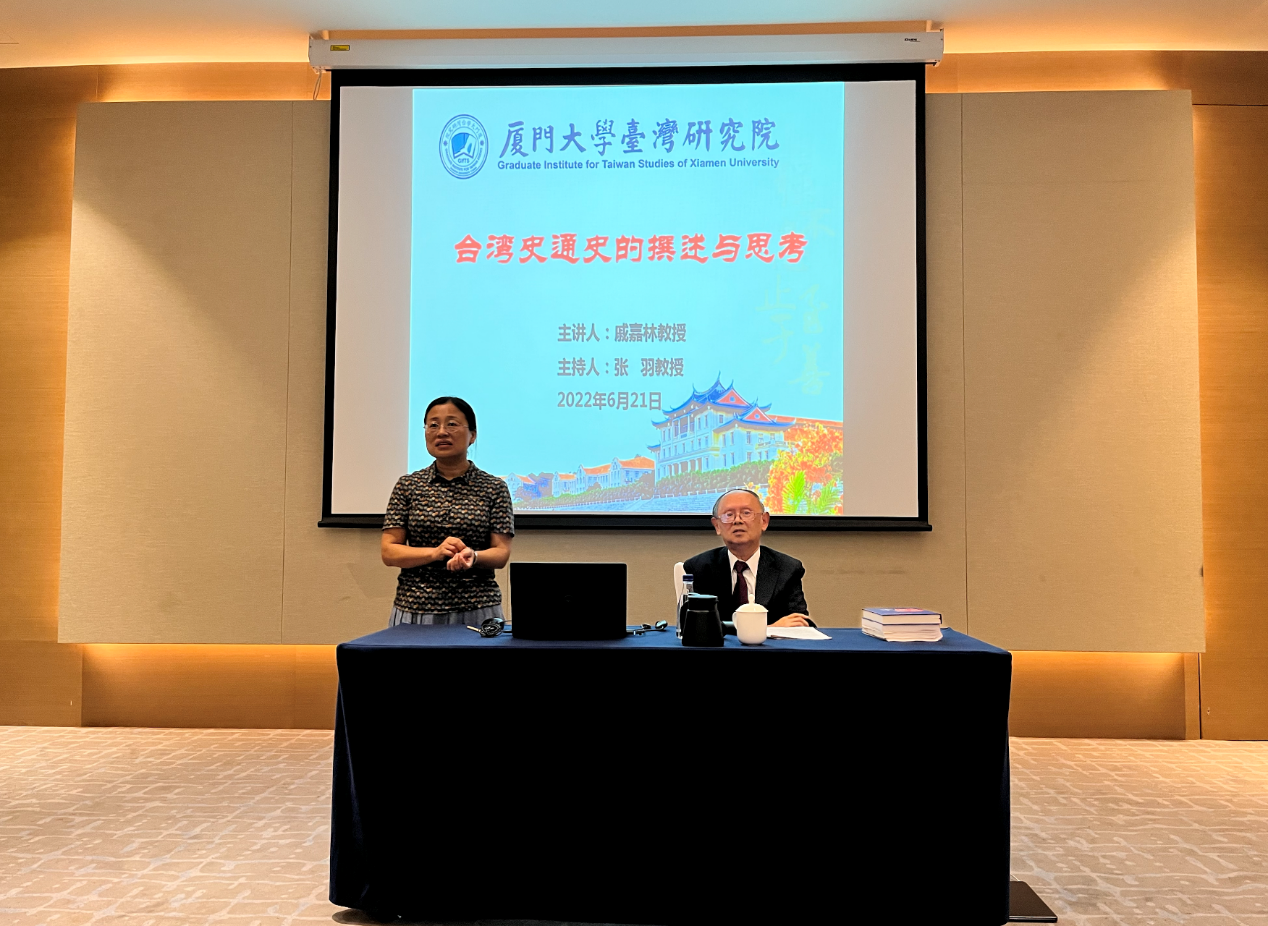 6月21日下午,于厦门佰翔五通酒店三楼格物A厅,台湾佛光大学、世新大学教授、中国统一联盟党主席戚嘉林应邀为我院师生作“台湾史通史的撰述与思考”的学术讲座。本场讲座由台湾研究院副院长张羽教授主持,邓孔昭教授、朱双一教授、陈小冲教授、陈忠纯教授、黄俊凌副教授、陈思副教授、王玉国助理教授及我院各所硕博士生参加。
