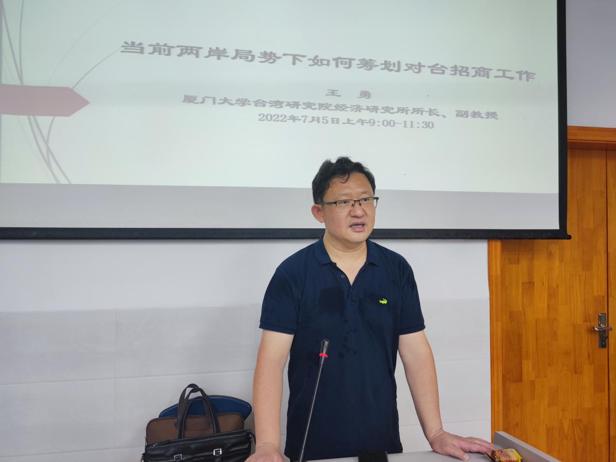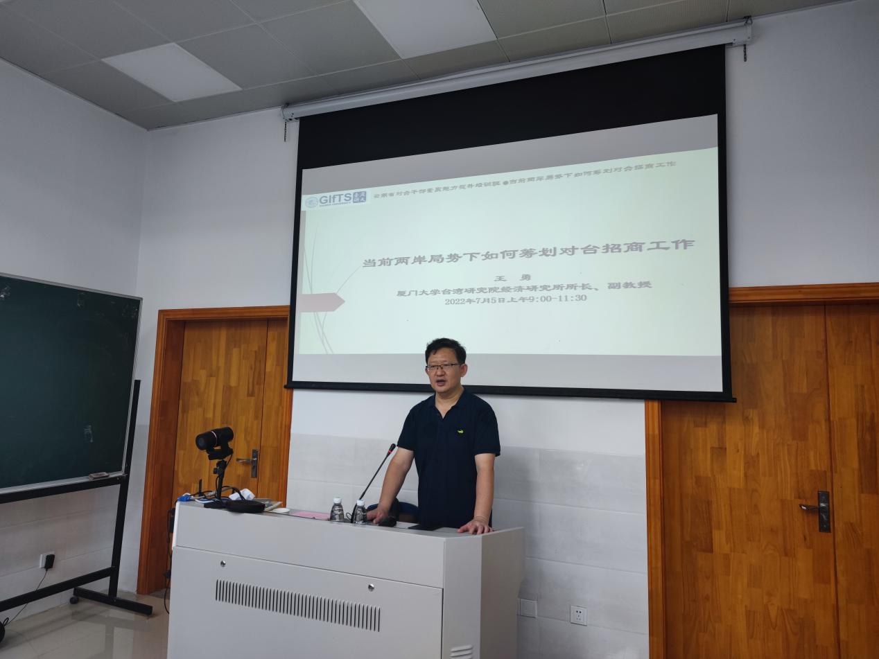 受999全讯白菜网公共事务学院邀请,2022年7月5日上午,我院经济所所长王勇副教授在999全讯白菜网公共事务学院成智楼,为“云南省对台系统干部能力素质提升培训班”的云南省对台系统50多位干部学员做专题讲座,主题为“当前两岸局势下如何筹划对台招商工作”。讲座主要涵盖“2020年台湾地区领导人选举后的两岸局势”、“台湾经济发展新态势对开展对台招商引资的影响”、“中美贸易摩擦对开展对台招商引资的影响”、“ECFA若无法续签对两岸经贸合作的影响”、“推动两岸对台产业合作的案例借鉴”等方面内容。