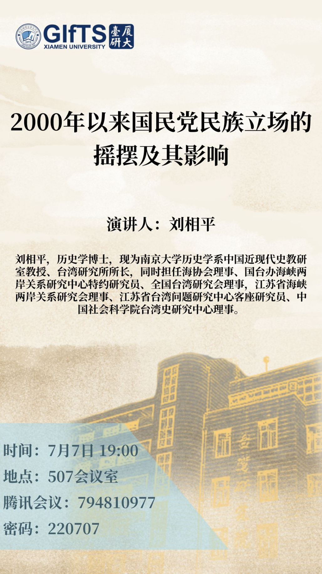 2022年7月7日晚上,南京大学历史系教授、台湾研究所所长刘相平教授应邀为我院师生作题为“2000年后国民党民族立场的摇摆及其影响”学术讲座,我院师生共六十余人以线上线下相结合的方式参会。