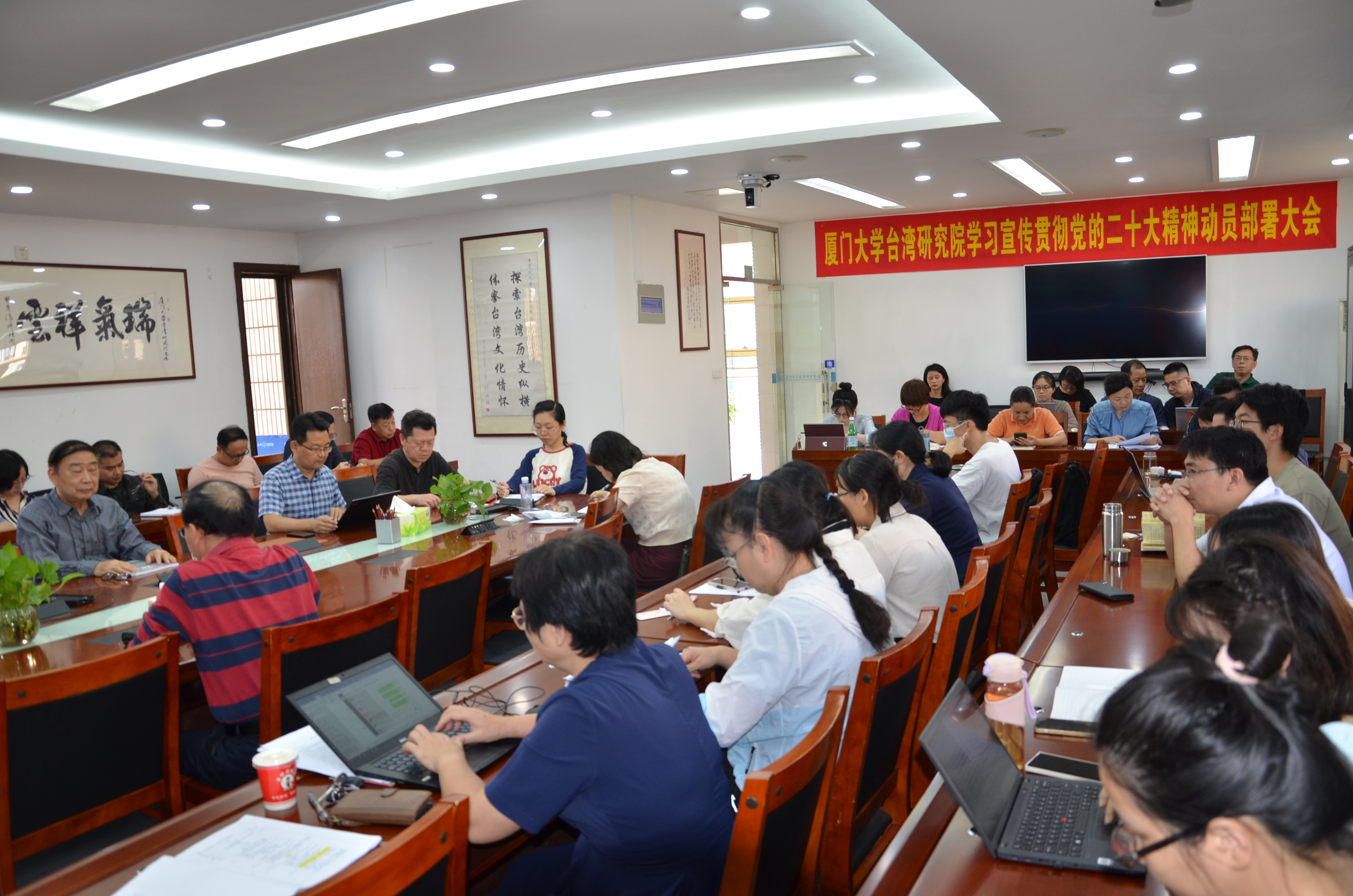曾云声书记强调学习宣传贯彻党的二十大精神是当前和今后一个时期全党全国的首要政治任务,全体同志要站在时代和全局的高度,充分认识学习宣传贯彻党的二十大精神是全面贯彻党的教育方针、加强学校党的建设和思想政治工作、深化全面从严治党的迫切需要,是全面落实二十大报告提出的高等教育发展战略目标,引导和激励广大师生员工以更加昂扬向上的精神状态深化综合改革、推进“双一流”建设、办好人民满意高等教育的迫切需要。全面增强学习宣传贯彻党的二十大精神的政治自觉、思想自觉、行动自觉。迅速掀起学习宣传贯彻党的二十大精神热潮,汇聚起磅礴的精神力量,在新时代新征程中展现新担当新作为,为全面建设社会主义现代化国家、全面推进中华民族伟大复兴贡献“厦大台研力量”。