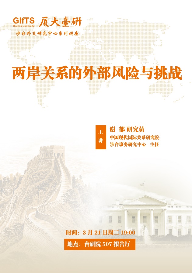 3月21日晚,中国现代国际关系研究院涉台事务研究中心主任谢郁研究员应邀为我院各所师生作题为《当前两岸关系的外部风险与挑战》的专题讲座。这是我院涉台外交研究中心承办系列学术活动之一,由院长李鹏教授主持,副院长季烨教授、法律所彭莉教授、政治所所长王贞威副教授、社会所副所长黄燕萍副教授等出席,来自政治、法律等各研究所的50余位硕博研究生参加。