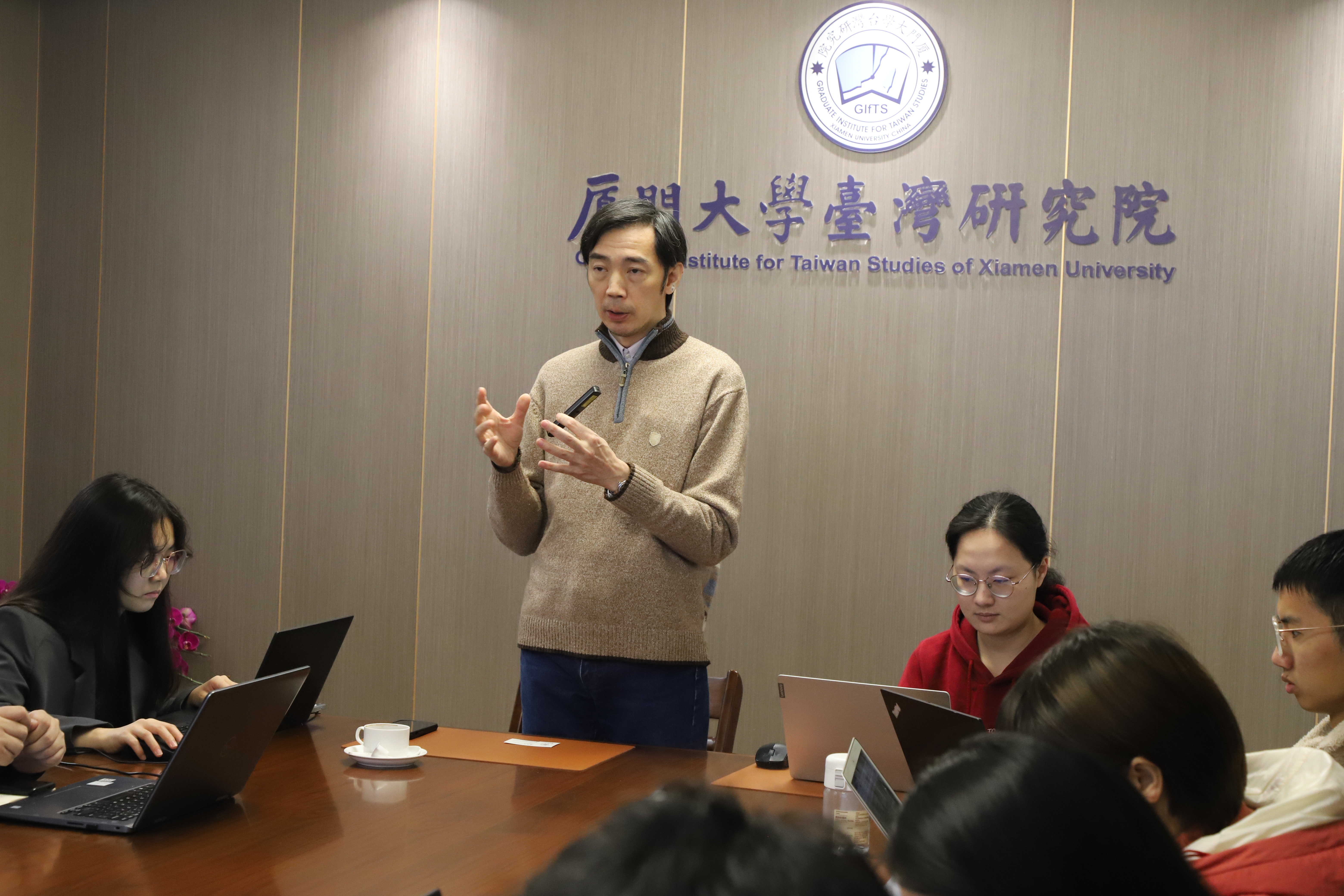 在交流环节,王恩国教授和与会师生展开热络互动,针对各自关注的议题展开深入探讨。王恩国教授逐一对大家的问题进行解答并进行拓展分析,围绕岛内政治经济以及选举方面的问题与大家作了进一步分享。