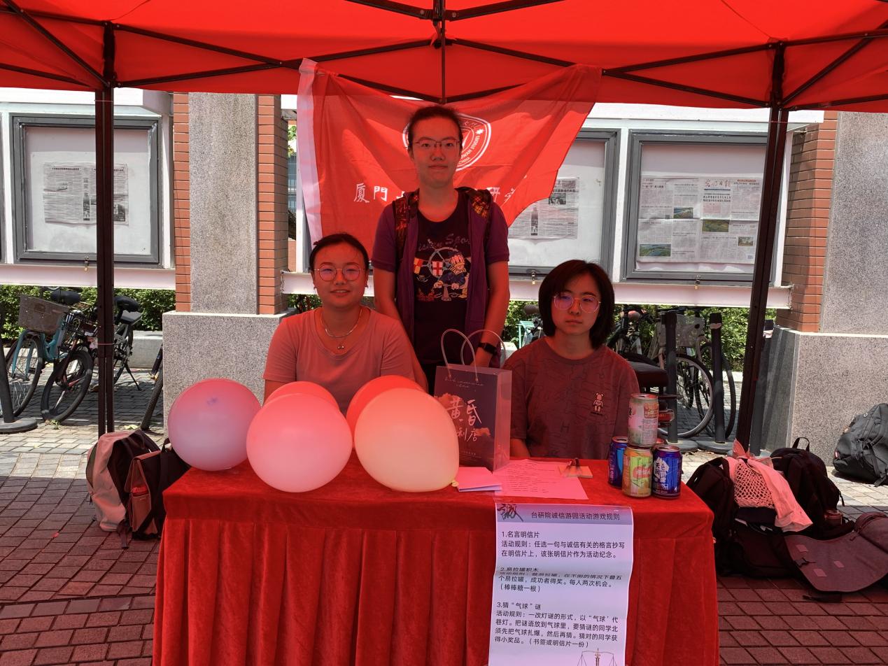 5月25日上午,为了推动构建诚实守信的校园文化,增强学生的诚信意识,2021级硕士生党支部和院研会在三家村学生活动广场共同开展以“互助诚信,相知相伴”为主题的活动。本次活动设置了“你来比划我来猜”、“易拉罐积木”和猜“气球”谜等游戏环节,支部党员在活动现场积极有序引导路过师生参与其中,有趣的游戏形式与细致周到的安排,令现场一片欢声笑语。参与活动的师生在欢乐的氛围中充分体悟到“讲诚信、守诚信、践诚信”的重要意义,活动取得圆满成功。