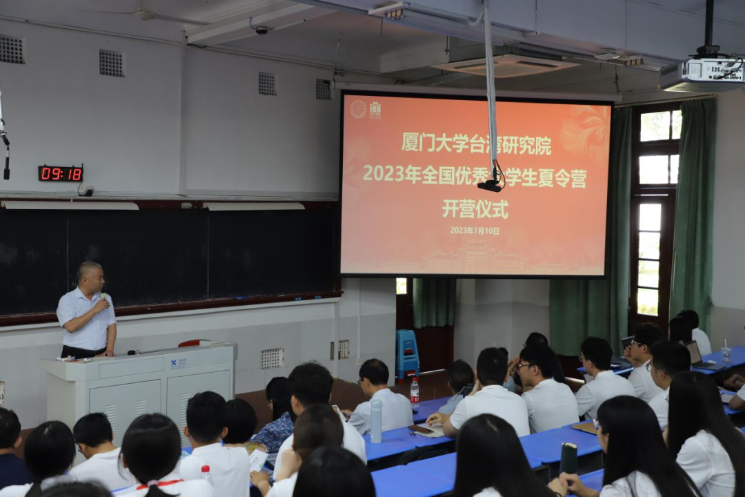 李鹏院长在开营典礼致辞中对参加夏令营的学子们提出了几点期许。他从情怀、责任和担当等方面阐述了作为台湾研究者所必备的素质。他说,当前正处于百年未有之大变局,希望同学们能深入系统地从多学科交叉的角度研究台湾问题。他向营员们详细讲述了台湾研究院的历史,以及学院在学术交流、课题研究、就业去向等方面的情况。
