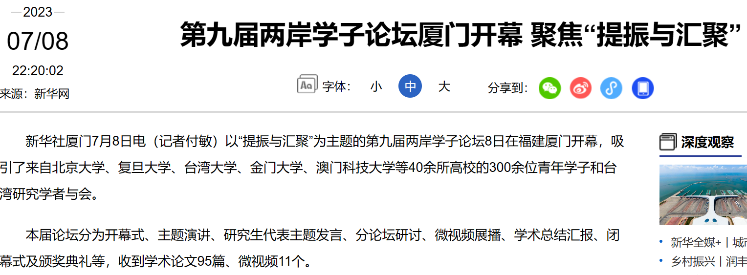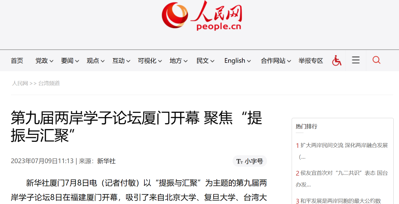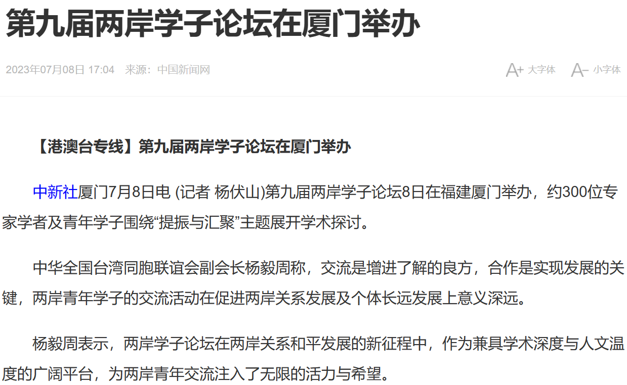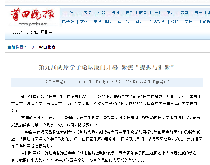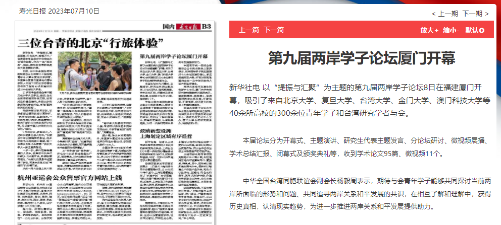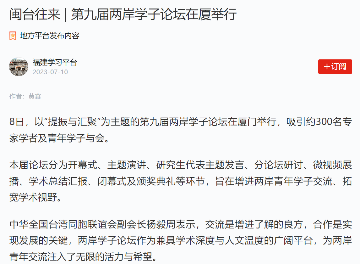 通过官方机构官网、新闻网站、报刊、电视、广播所形成的全媒体传播矩阵,第九届两岸学子论坛得到海峡两岸各界的广泛关注。近年来,借助媒体的大力宣传,尤其是重量级央媒的加持,两岸学子论坛累积了不小的媒体声量与影响力,知名度及美誉度不断提升和拓展。