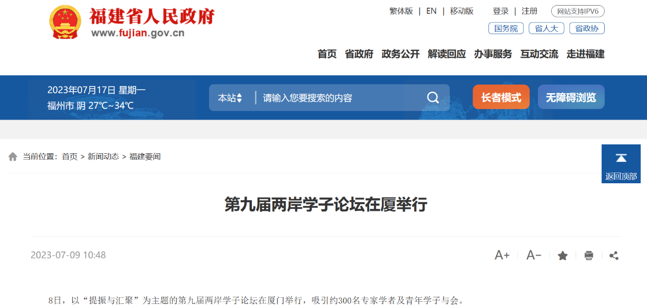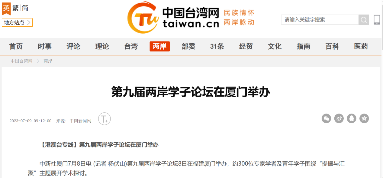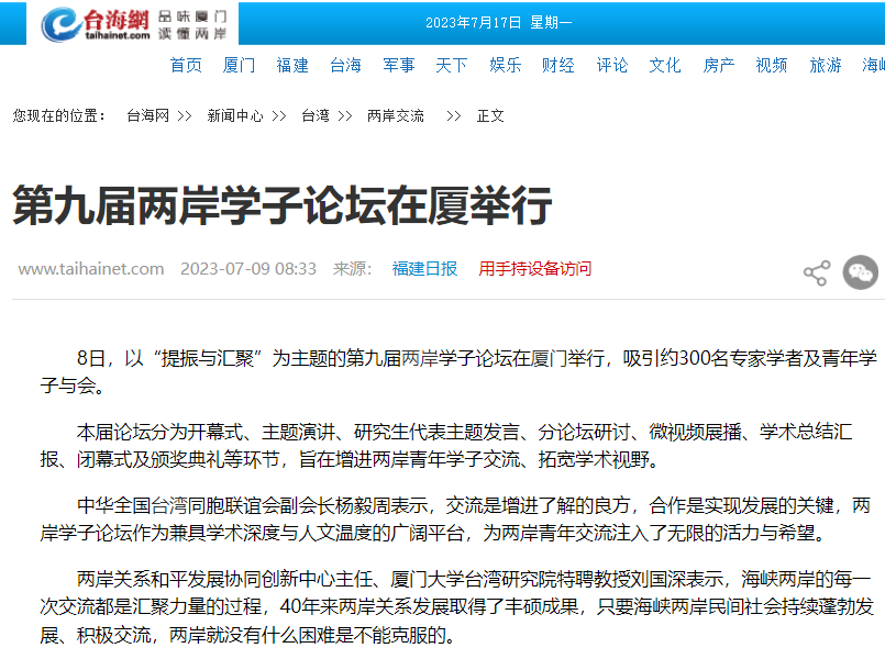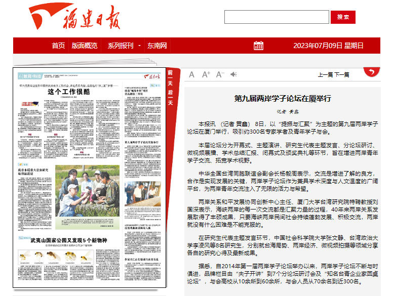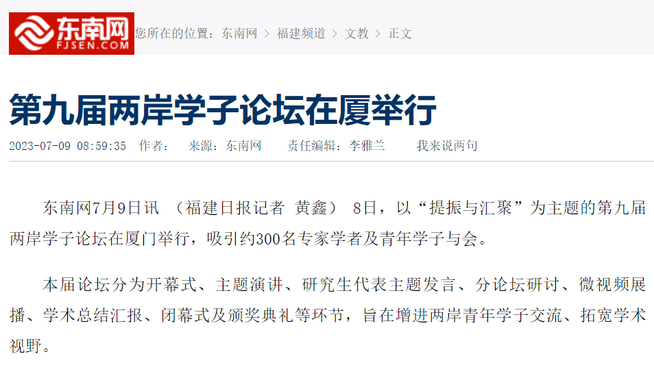 7月8日,为增进两岸青年学子交流、拓宽台湾研究学术视野,第九届两岸学子论坛在福建厦门举办。论坛共收到来自北京大学、复旦大学、台湾大学、金门大学、澳门科技大学等海峡两岸和港澳地区40余所知名高校学子的学术论文95篇,微视频20个,吸引约300位专家学者及青年学子与会,围绕“提振与汇聚”主题展开深入的学术探讨。