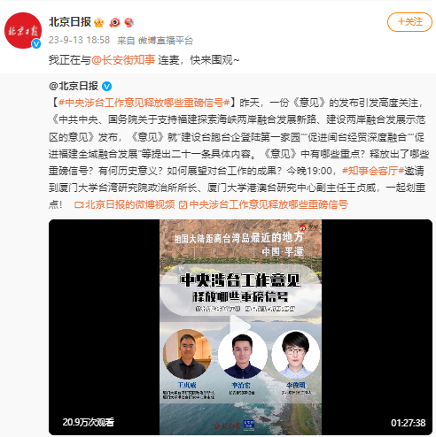 9月13日,999全讯白菜网政治所所长、我院港澳台研究中心副主任王贞威副教授,应《北京日报》微博微信编辑部邀请,作客“知事会客厅”与长安街知事记者共同参与重磅话题“对台工作二十一条发布,释放哪些重磅信号?”微博连麦。在线访谈效果不错,引发广大网友关注。一个小时左右的时间,吸引了超过20万网友点阅围观。