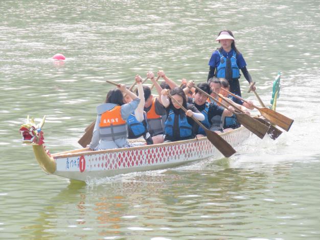 在鼓声和呐喊中,由王辉、霍俊先、蔡玉洁、康靖宜、佘倩婷、许含曦、彭智豪、任静、闻敏和高艳琼等同学组成的龙舟赛团队通力协作,伴随着默契、协调的节奏一同朝着终点划桨冲刺,传递着青春能量与热血精神,展现了我院学子的良好风采。